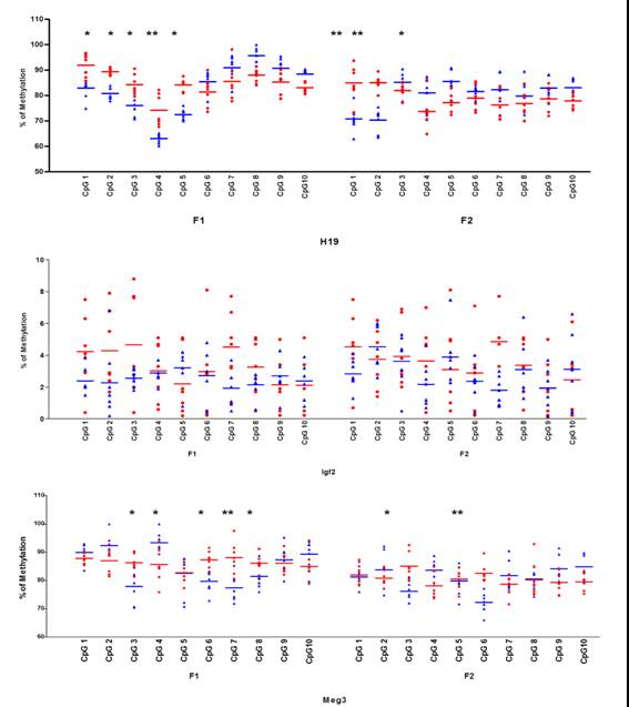 BaP诱导未暴露后代印记基因DMR区甲基化水平改变。亚硫酸盐焦磷酸测序测定未暴露的F1-2后代精子DNA印记基因H19、Peg1和Igf2以及印记基因Meg3、Peg3和Snrpn的甲基化水平。显示的数据是来自BaP2.5和对照组的各7只实验动物独立CpG位点的甲基化水平。比较对照组小鼠,横线代表均数。*,q<0.05(FDR,通过多重测试纠正)