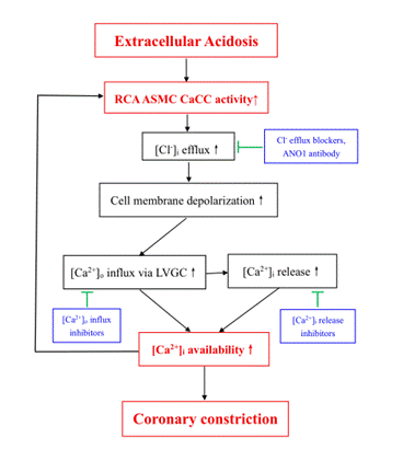 研究发现,相对于大鼠肾内动脉、脑基底动脉、肠系膜动脉平滑肌层及其动脉平滑肌细胞,大鼠冠状动脉及其动脉平滑肌细胞表达了更多的TMEM16A/ANO1,由细胞内钙释放和外钙内流引起的细胞内Ca2+升高和钙激活氯通道引发的Cl-外流在大鼠冠状动脉对细胞外酸中毒高收缩反应性中起重要作用。这些结果提示,调节动脉平滑肌细胞钙激活氯通道的活性和细胞内的Ca2+水平可能会成为一个新的,有效的预防和治疗酸中毒引起的心脏-冠状动脉问题的新方法。