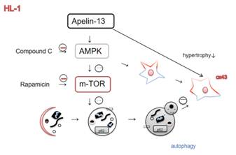 李学文课题组进一步探究Apelin-13的作用机制,用CompoundC(AMPK抑制剂)或者Rapamycin(mTOR抑制剂)与Apelin-13共同处理模型细胞,探讨AMPK/mTOR通路在Apelin-13调控AngII诱导HL-1细胞Cx43下调和心肌肥厚的机制(图2)。结果显示,Apelin-13可以通过激活AMPK/mTOR通路逆转AngII诱导的HL-1细胞Cx43重构和细胞肥厚。