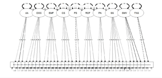 最终的QOLS-CVI包括38个条目、10个子域和6个域。信度通过Cronbach 's alpha系数、分半信度和重测信度进行验证(全量表Cronbach 's alpha值为0.841;分半信度0.629;重测信度0.888)。效度结果显示多维度量表符合预期:探索性因子分析和验证性因子分析均显示该量表具有良好的拟合模型。