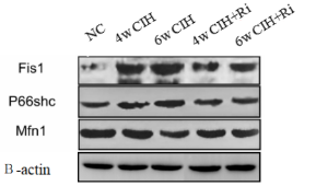 最近的研究表明,CIH可以通过调节线粒体功能引起靶器官损伤。由于高能量需求,肾小管上皮细胞富含线粒体,因此线粒体在肾脏疾病发病机制中所发挥的作用成为近年来的研究热点。之前的研究表明,线粒体损伤和线粒体氧化应激可以导致肾小管细胞损伤,并在肾脏疾病中诱导细胞凋亡。线粒体是活性氧(Reactive oxygen free radical species,ROS)产生的主要来源。过量的ROS会导致氧化应激和线粒体功能障碍,引起细胞衰老、损伤和凋亡。线粒体还是动态的细胞器,其不断发生分裂和融合,以维持一个健康的线粒体池。线粒体动力学受到促融合有丝分裂融合蛋白:丝裂融合蛋白1和2(Mitofusins 1 and 2, Mfn1、Mfn2)、视神经萎缩(Optical atrophy,OPA1)以及促分裂蛋白:动力相关蛋白1(Dynamin related protein 1, DRP1)、线粒体裂变蛋白1(Mitochondrial fission 1, Fis1)的精细调节。P66Shc是属于ShcA家族的一种衔接蛋白,一些研究表明,p66Shc激活和磷酸化可诱导线粒体断裂,能增加分裂蛋白和凋亡因子之间的相互作用,并激活下游凋亡途径。