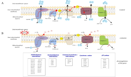 注:A 对照组中线粒体氧化呼吸复合体的结构图;B 氧化呼吸复合体 I-V 活性降低后 ROS 的产生部位,以及微阵列数据中与复合体相对应的下调基因列表