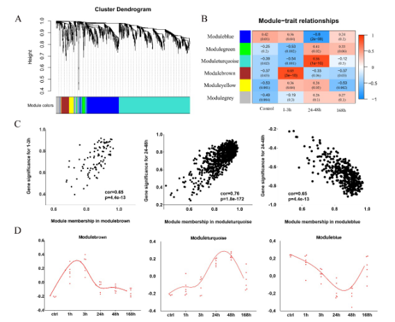 C 不同模块的GS和MM的相关性;Cor:相关系数;D不同模块中基因的表达变化趋