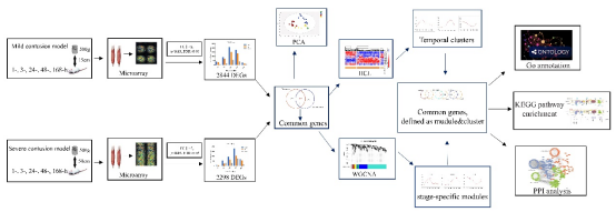 2 两挫伤组共表达基因主成分分析和层次聚类分析