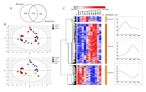 注: A 轻度和重度挫伤组间DEGs的Venn图;B轻度和重度挫伤组1620个共有基因的PCA结果;C所有DEGs基于层次聚类的热图(左:-M和-S分别表示轻度和重度损伤),以及每个基因簇根据伤口年龄的平均表达(右)