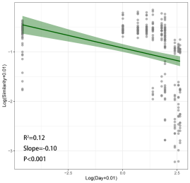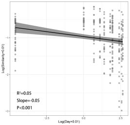 2 物种相似度与时间间隔的线性关系a:对照组,b:CO,c:酒精,d:CO+酒精