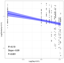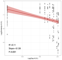 我们对微生物群落的物种相似度与时间间隔进行了线性拟合(图2)。四组处理的物种相似度与实际间隔均呈现出显著(P<0.001)的线性关系,表明利用微生物群落演替来预测各组处理样品的死亡时间是可行的,不同处理组线性模型的斜率(slope)不同,表明演替速率差异。其中CO中毒死亡组演替速率最快,,而对照组的演替速率最慢。