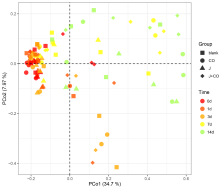 基于Bray-curtis距离的PCoA分析用于展示样本之间微生物群落差异(图1)
