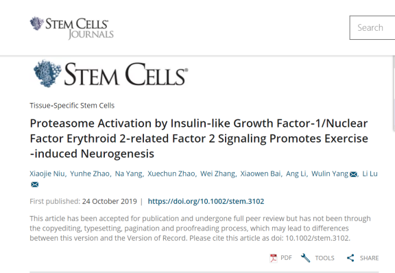 近日,我校基础医学院2017级博士研究生牛晓洁,在国际干细胞研究领域著名期刊《StemCells》发表题为Proteasome Activation by Insulin-like Growth Factor-1/Nuclear Factor Erythroid 2- related Factor 2 Signaling Promotes Exercise-induced Neurogenesis研究论文。Stem Cells期刊偏重于干细胞功能和干细胞治疗应用相关领域的研究,是干细胞研究领域的主流权威期刊。我校青年教师赵云鹤为共同第一作者,基础医学学院陆利教授和中科院中科院合肥物质科学研究院医学物理与技术中心杨武林教授为共同通讯作者。