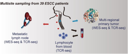 研究人员对来自39例肿瘤样本的185个肿瘤区域和39个匹配的正常样本进行了测序分析,平均测序深度分别达到290×和187×。共检测到11,703个非沉默单核苷酸变异和961个插入缺失变异,每个样本中位数为189个非沉默变异和14个插入缺失,突变数量在个体中差异很大。具有较大肿瘤体积的食管鳞癌个体的突变负荷高于具有较小肿瘤的个体。同时发现通过多区域测序鉴定的个体的突变显著高于单区域分析或来自癌症基因组图谱(TCGA)突变数据的突变。此外还发现有12.8%的ERBB4突变,并且功能实验证明了它的致癌作用;敲低BRCA1/2的表达,显著增加了食管鳞癌细胞对铂类药物的敏感性;5%的个体携带CD274的局部高水平扩增,导致PDL1的大量表达,这类个体可能对免疫检查点阻断更敏感。该研究揭示了食管鳞癌中的高度异质性,确定了ERBB4、BRCA1/2和PD-L1这几个潜在的治疗靶点,并可能为食管鳞癌治疗提供新的策略。