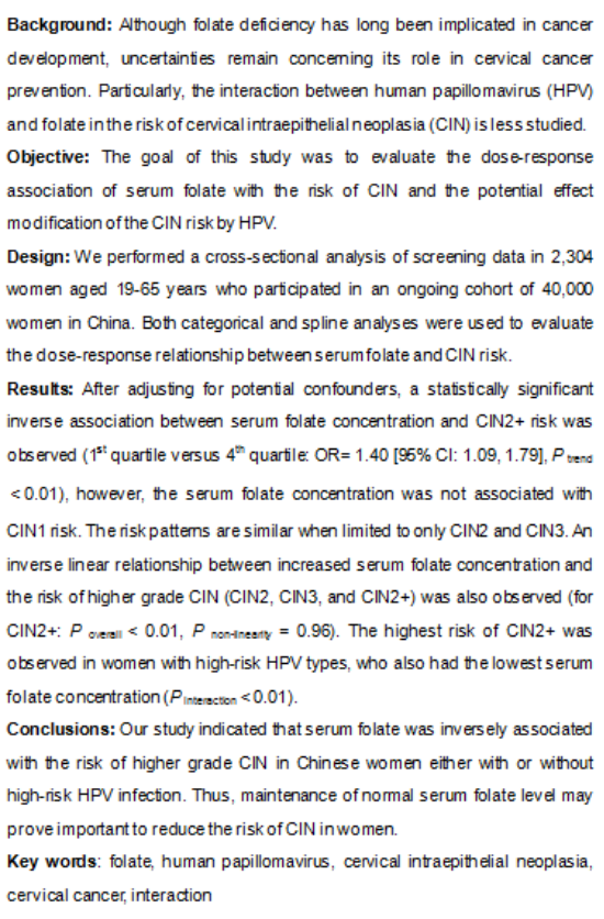 宫颈癌是女性第二大癌症,主要由HR-HPV感染引起。CIN作为宫颈癌前病变,为预防宫颈癌的发生提供了良好的契机。这篇发表在AJCN上的大规模人群研究指出,血清叶酸显著地影响了高级别CIN和子宫颈癌的患病风险,特别是考虑到血清叶酸和高危型HPV之间的相互作用所产生的显著的不良影响,可以通过制定一定的策略以在未来的前瞻性随访研究中深入研究其交互作用,并通过与叶酸相关的饮食改变来降低子宫颈癌的风险。