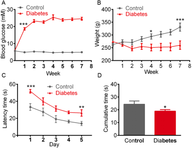 图1糖尿病大鼠的血糖水平,体重和认知功能A,实验期间糖尿病和对照大鼠的空腹血糖水平;B,体重曲线;C,为两组大鼠定位航行试验中逃逸潜伏期的比较;D,为两组大鼠空间探索试验中目标象限逗留时间的比较。*,**和***分别与对照相比p <0.05,p <0.01和p <0.001。