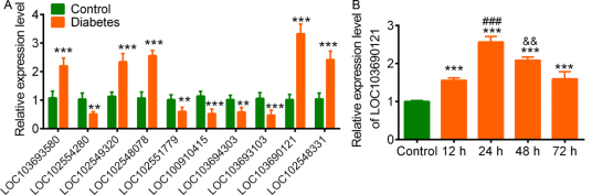 图4.高葡萄糖对LOC103690121表达的影响A,葡萄糖处理后10个显着表达lncRNAs的相对表达水平。B,LOC103690121葡萄糖处理后的表达模式