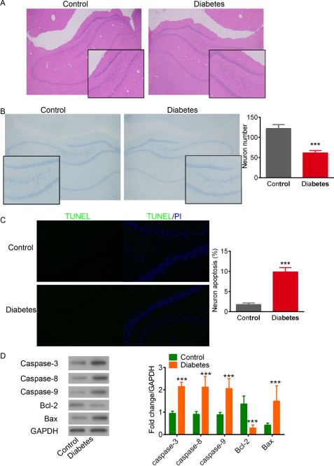 HE和Nissl的染色显示,与对照相比,糖尿病大鼠的海马神经元减少(图2A和B)。TUNEL检测显示糖尿病大鼠TUNEL阳性(绿色)凋亡神经元的百分比高于对照(图2C)。Western印迹分析显示糖尿病海马中caspase-3/8/9和Bax的表达显着高于对照组(p <0.001);糖尿病大鼠中Bcl-2的表达低于对照(p <0.001,图2D)。这些数据显示糖尿病与大鼠海马神经元凋亡增加有关。