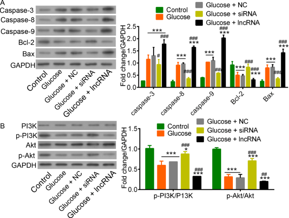 图6.Western印迹分析.A,凋亡相关蛋白的倍数变化,B,PI3K / Akt途径蛋白的倍数变化。*和***分别与对照相比p <0.05和p <0.001。相对于葡萄糖处理,#,##和注意到p <0.05,p <0.01和p <0.001。