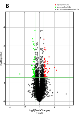 图3.差异LncRNA火山图图中每个点代表一个基因,红色代表上调基因(fold change>1.5倍,P<0.05),绿色代表下调基因(fold change>1.5倍,P<0.05),黑色为无差异表达基因。