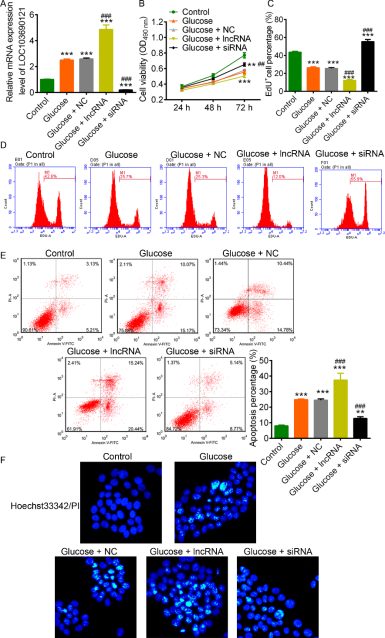 图5.LOC103690121促进葡萄糖诱导的神经元凋亡A,LOC103690121相对表达水平,C和D细胞存活率分析,EdU阳性细胞百分比,E,流式细胞仪检测细胞凋亡,F,hoechst33342 / PI双染(放大倍数×200)。**和***分别与对照相比p <0.01,p <0.001。注意到与葡萄糖处理相比p <0.001。