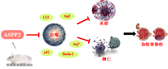 自噬是一进化保守的细胞内溶酶体分解代谢过程,是肾脏在病理性应激条件下维持细胞内自稳态和保证细胞可存活的重要机制之一。自噬的激活可对急性肾损伤发挥保护性作用,而长期的或持续性自噬可能引起自噬性凋亡进而加重细胞损伤。研究发现,ASPP2可以负向调控自噬。ASPP2可通过减少LC3-II和其他自噬相关基因的表达,抑制AMPK-mTOR途径中的AMPK、TSC2磷酸化而抑制自噬潮的上调。ASPP2还能通过竞争性抑制Atg5-Atg12复合体和Atg16L1的结合进而抑制RAS诱导的细胞自噬。此外,ASPP2也能通过从细胞质的Bcl-2-Beclin-1复合体中释放Beclin-1而诱导细胞的自噬性凋亡。