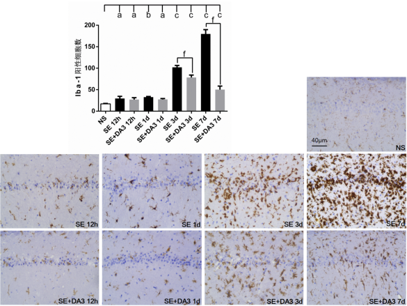 图4各组大鼠海马CA1区Iba-1阳性细胞数及免疫组织化学图片(×200)
